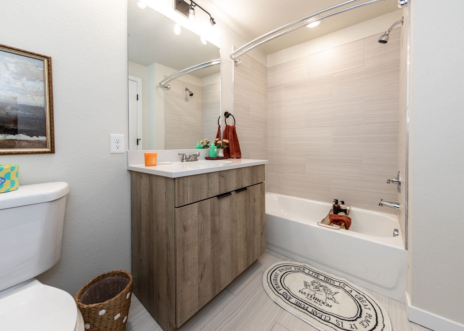Brand New First Floor 2 Bedroom, 2 Bathroom end unit with attached 2 car garage. This room provides extra space with a walk in entry to the hall. This is one of our BEST and BIGGEST units, with more light and comfort. In the kitchen there's a grey backsplash surrounded by superior quality cabinets and a large, quartz kitchen island. The bathroom counters are quartz, and the flooring is LVP.