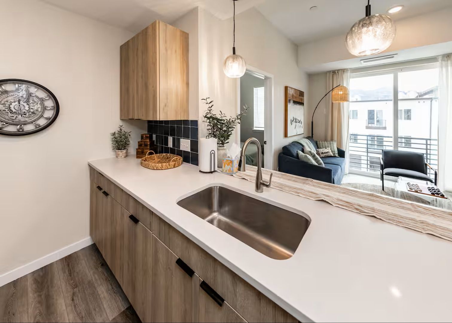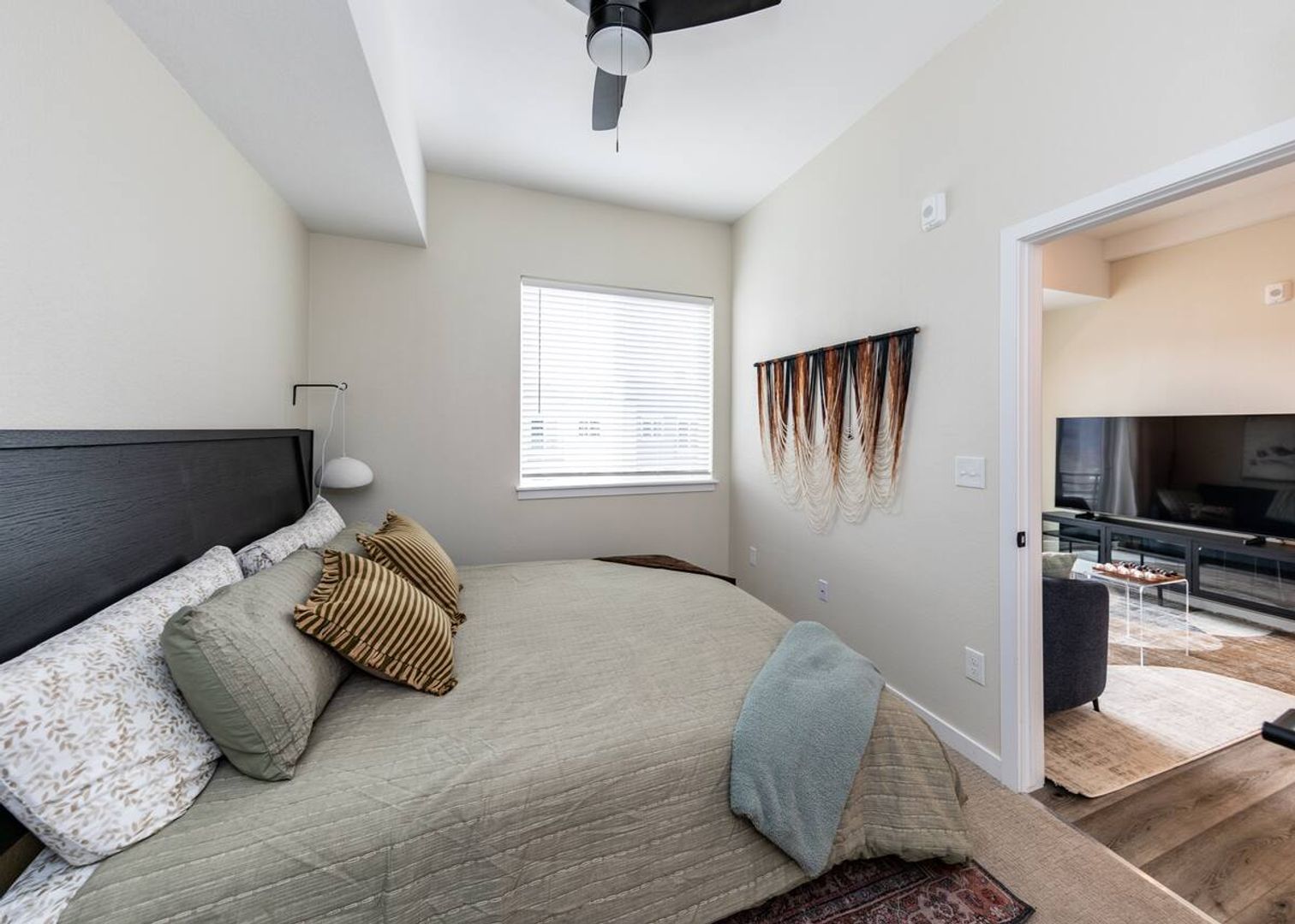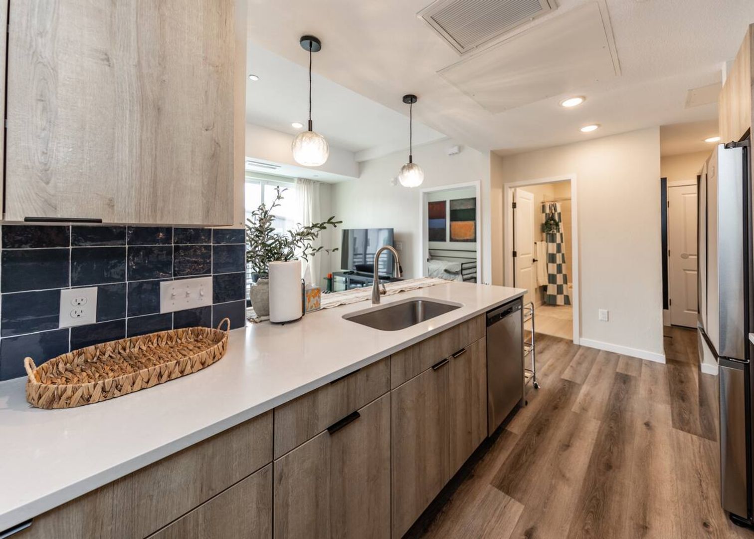 Awesome floorplan with bedrooms and bathrooms separated on either side! Gives privacy while also being connected through the cozy, bright living room and well-designed, functional kitchen. Kitchen features superior cabinets, fun backsplash, black, modern hardware, a large island and beautifully, unique pendants. Stainless steel appliances and a galley kitchen layout. Enjoy looking out your sliding doors and Juliette balcony!