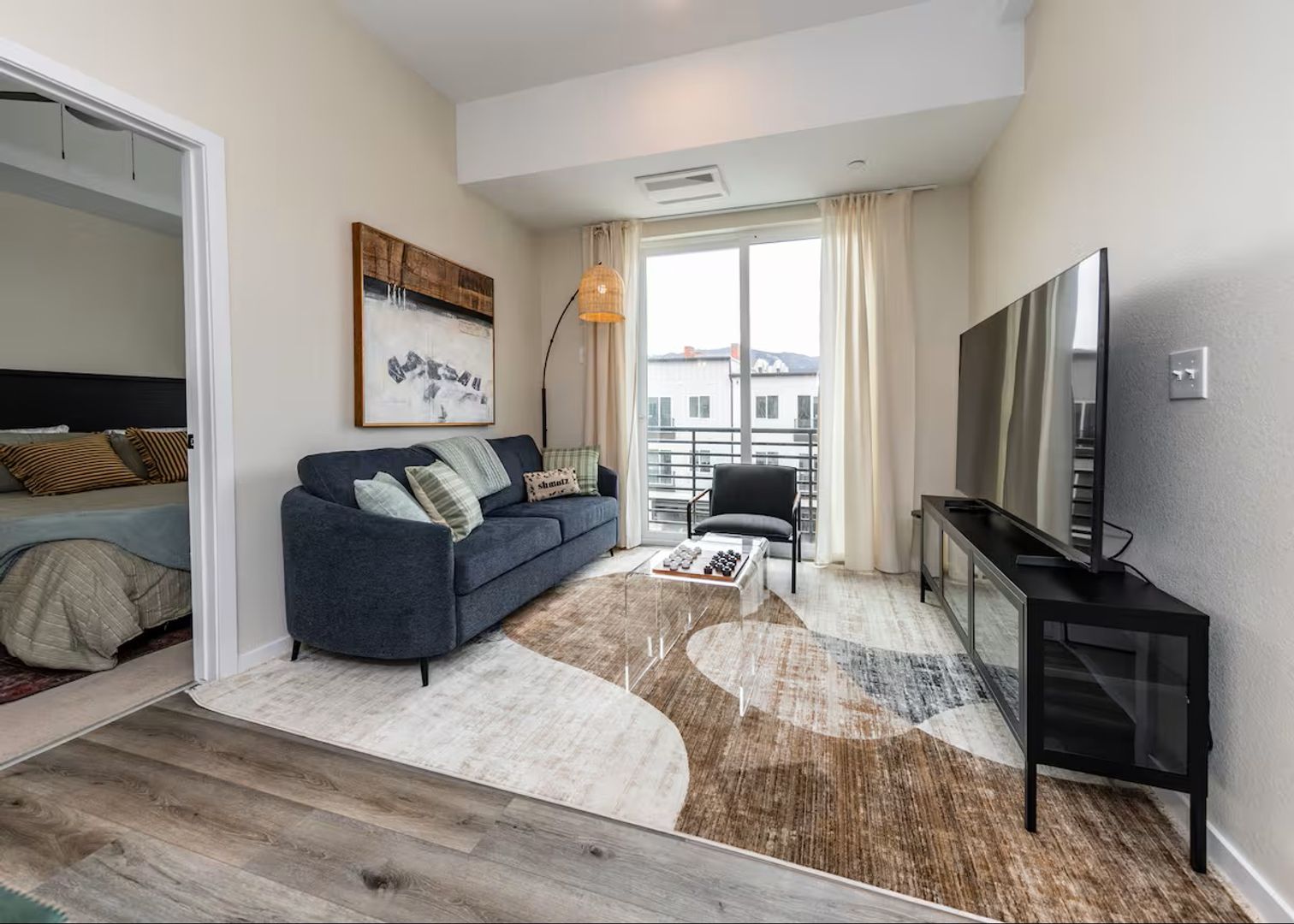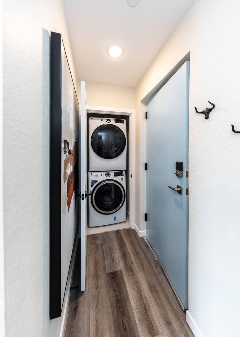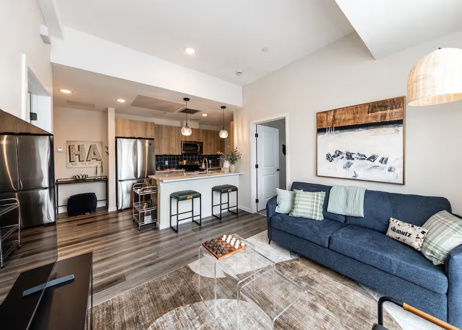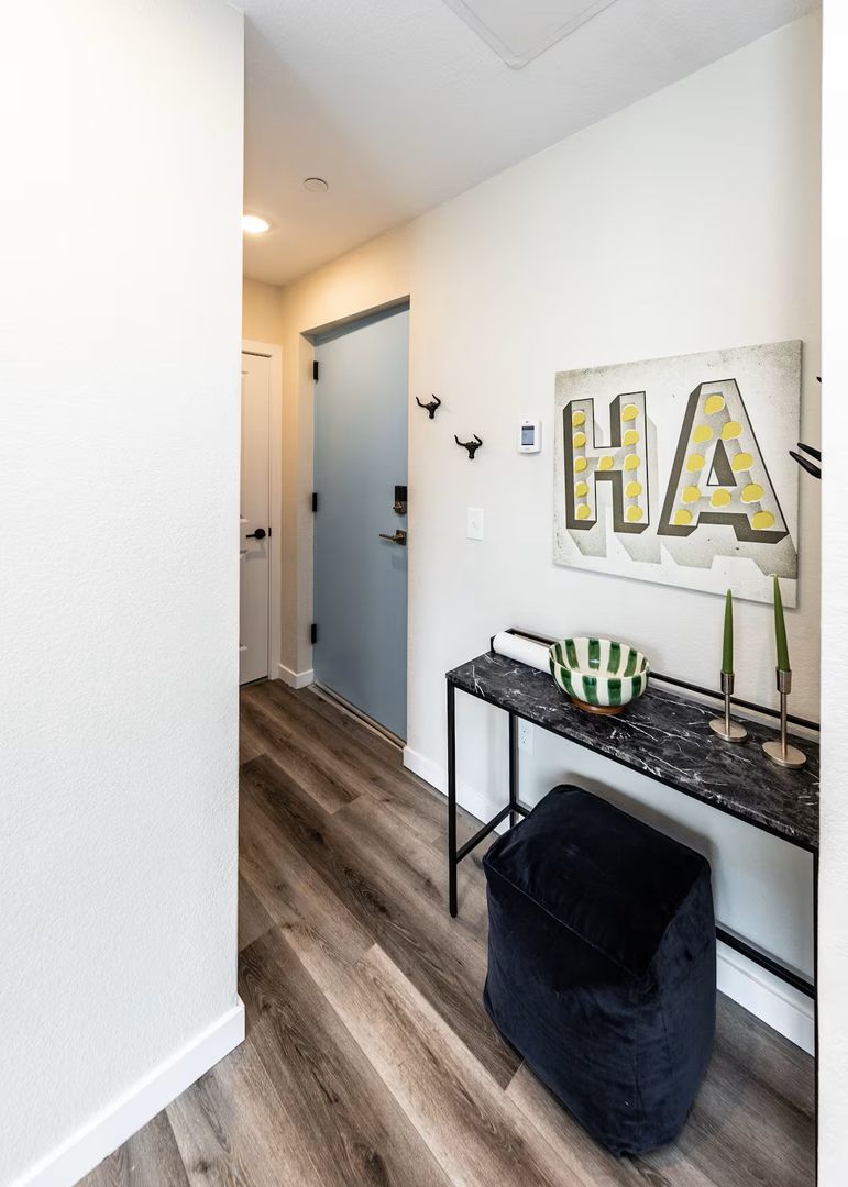 Awesome floorplan with bedrooms and bathrooms separated on either side! Gives privacy while also being connected through the cozy, bright living room and well-designed, functional kitchen. Kitchen features superior cabinets, fun backsplash, black, modern hardware, a large island and beautifully, unique pendants. Stainless steel appliances and a galley kitchen layout. Enjoy looking out your sliding doors and Juliette balcony!